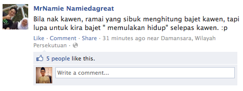 Coudn’t agree more dengan status ni. Actually dari segi financial, takde masalah sangat sebenarnya nak kahwin. Worst case scenario, boleh je amik personal loan/pinjaman koperasi 20-30 ribu untuk kahwin. Bunyi macam kesian tapi itulah hakikat kehidupan sekarang. Nak kahwin pun ada yang sampai kena pinjam duit daripada bank.