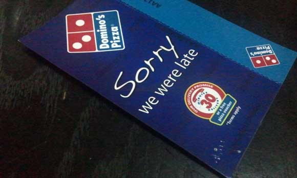 - Bila pizza sampai, 30 minit jaminan penghantaran tadi dah terlepas. Anda akan menerima kupon regular pizza percuma.