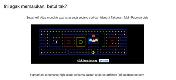 Tak salah menambah fungsi pada sesuatu, betul tak? Jadi saya masukkan permainan Pacman di page tersebut. Kenapa page tersebut? Supaya orang yang cari sesuatu kat sini, tapi tak jumpa boleh menghiburkan diri dengan Pacman. Selain tu, URL bebas, tak perlu orang ingat.