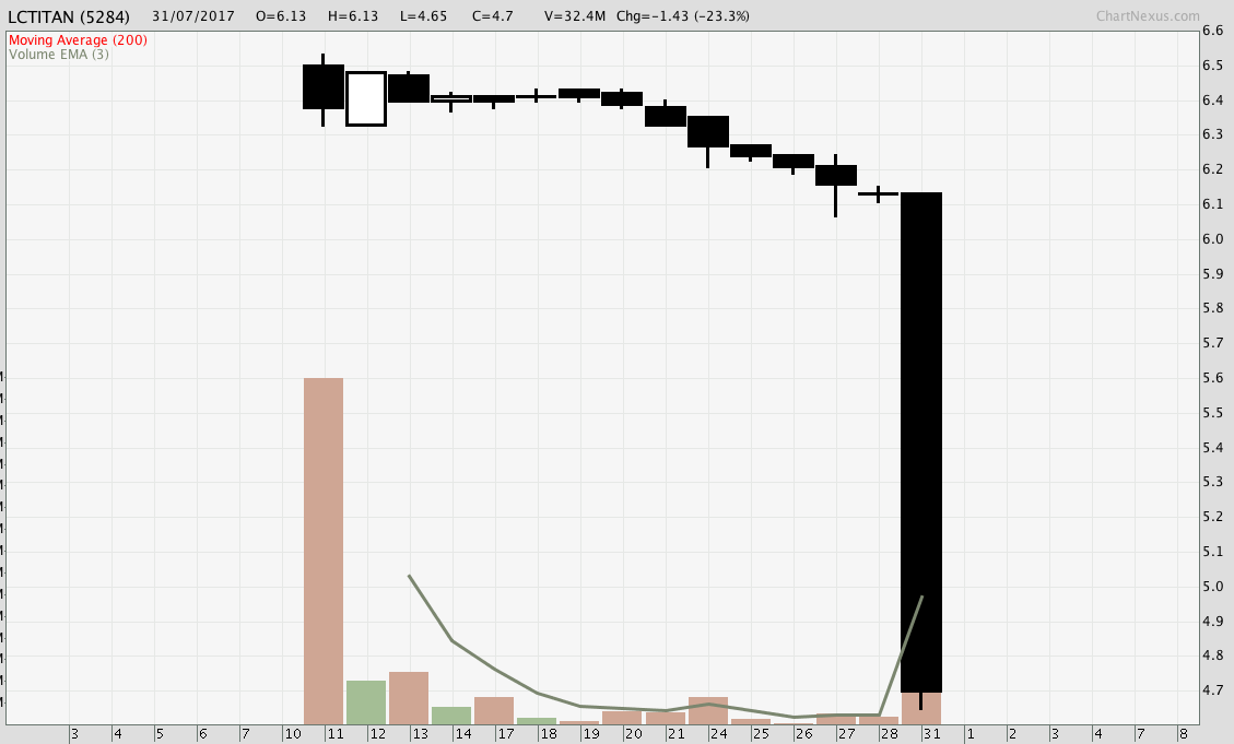 Pada awalnya, harga IPO ditetapkan pada RM8 tapi mungkin sebab tak berapa laku, diturunkan jadi RM6.50. Rata-rata perbincangan di wall fb pelabur runcit tentang LC Titan ni semuanya positif sebelum IPO. Memang trendy. Semua orang pakat nak beli. Tak dapat kat Miti, masuk melalui public balloting. Hebat2.