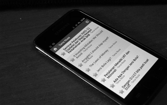 Dengan penggunaan aplikasi Google Reader untuk Android (tak tahu samada wujud ke tak aplikasi ini untuk iOS dan Blackberry), blog dan laman web berita kegemaran saya kini di tangan saya. Bolehlah mengisi masa ketika dalam perjalanan pergi dan pulang ke kelas dengan membaca.