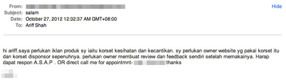 Email ni masuk semalam. First time baca rasa macam nak tergelak pun ada. Ingatkan pengirimnya nak suruh saya review korset. Gila ke? Mana reti nak review benda-benda macam ni.
