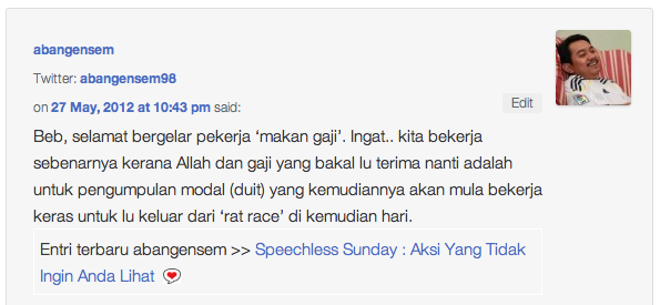 berusahalah untuk keluar dari rat race ni secepat yang boleh..aku dah dekat nak terkeluar ni..nak pergi tandas jap.. hehehe