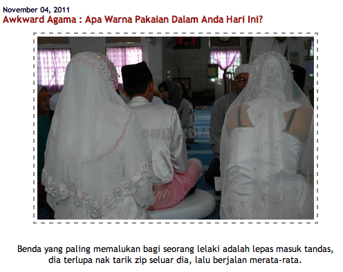 Cuma satu problem dia – pakaian dalam tu striking atau contrast dengan baju nikah yang berwarna putih tu atau tudung tak cukup labuh, maka terjadilah ‘persembahan umum’ dalam masjid.
